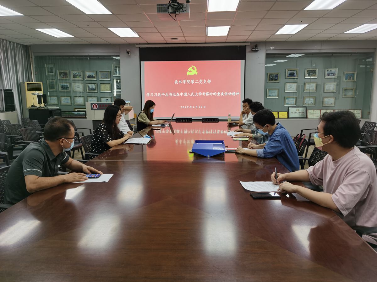 在五四青年节即将到来之际,中共中央总书记、国家主席、中央军委主席习近平4月25日上午来到中国人民大学考察调研,并主持召开师生代表座谈会,发表重要讲话。4月26日、27日,美术学院召开党政联席会、教工第二党支部会议,学习贯彻习近平总书记在中国人民大学考察时的重要讲话精神会议,深入学习贯彻习近平总书记重要讲话精神,进一步统一思想、提高认识,推动形成生动实践。美术学院各党支部、各班级通过多种形式收听收看相关新闻报道,迅速在师生中掀起学习热潮,让讲话精神在师生心中落地生根。
