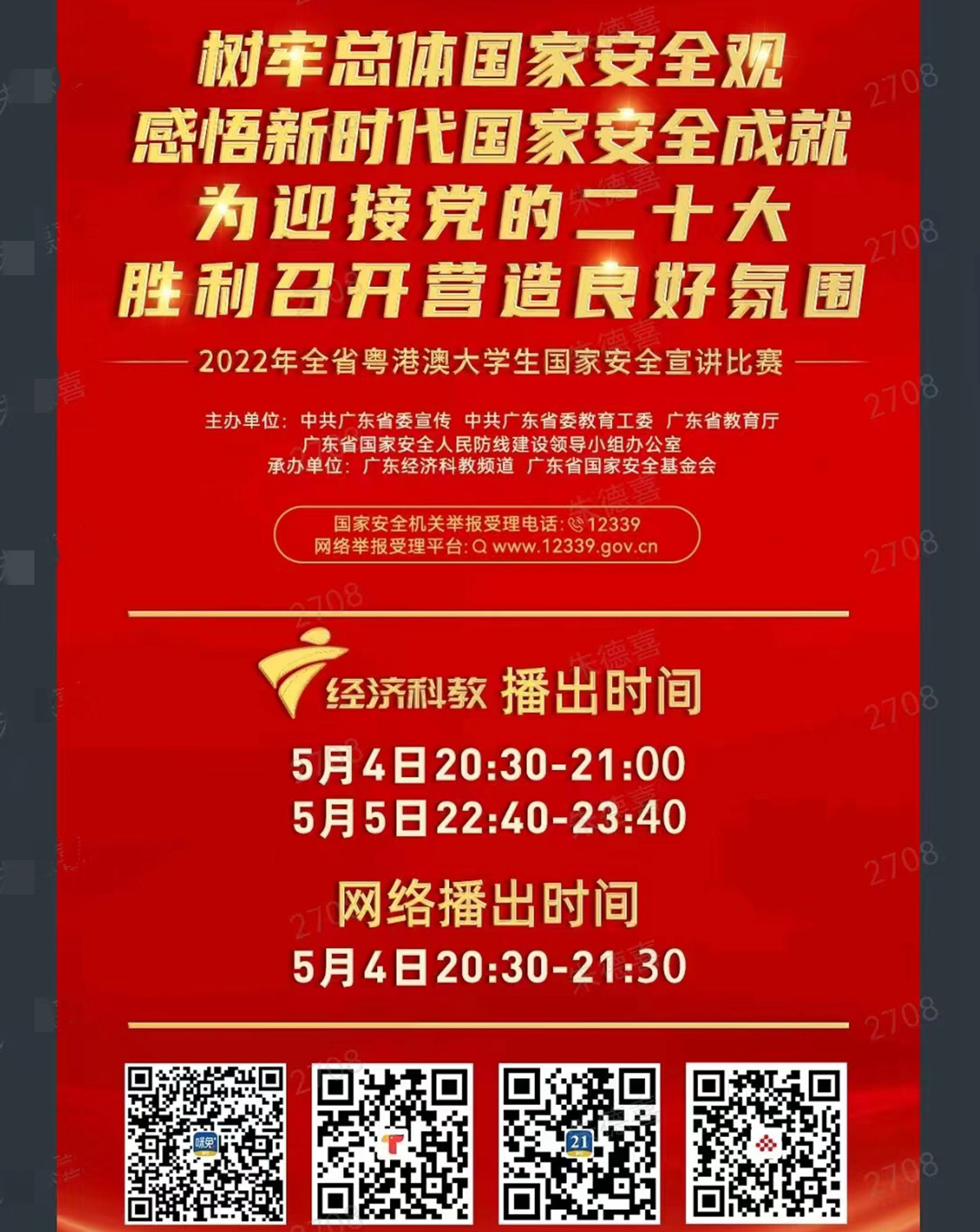 据了解,本次比赛由广东省委宣传部、省委教育工委、省教育厅、省国家安全人民防线建设领导小组办公室联合主办,以“树牢总体国家安全观 感悟新时代国家安全成就,为迎接党的二十大胜利召开营造良好氛围”为主题,以宣讲展现当代粤港澳大学生风采,进一步提升全民国家安全意识和反奸防谍意识,汇聚全社会维护国家安全的力量,坚固人民防线,深入贯彻总体国家安全观,提升高校国家安全宣教能力,激发人民防线奋斗百年路 启航新征程的使命担当。