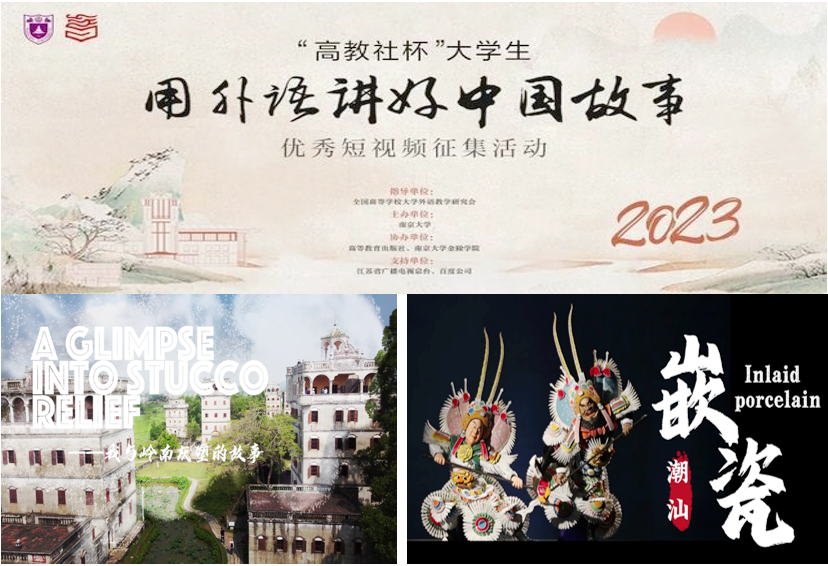 近日,由全国高等学校大学外语教学研究会指导、南京大学联合高等教育出版社共同举办的2023年“高教社杯”大学生“用外语讲好中国故事”优秀短视频作品征集活动评选结果发布。由刘雯璇、王瑛老师指导,邱湛富、郑家杰、曾盈盈、梁译丹、邓伟榕同学制作的作品《我与岭南灰塑的故事》和李逸涵老师指导,陈雅琪、郑佳琳、方静丽、汤诺瑶、朱浚仪同学制作的作品《穿越百年的声音·嵌瓷》荣获广东省一等奖。