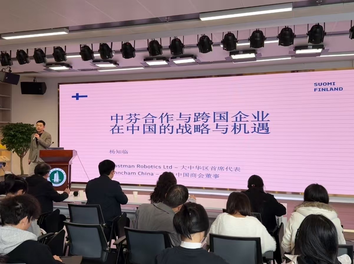为深入学习贯彻党的二十届三中全会精神和全国教育大会精神,全面提升开放办学水平,进一步扩宽师生国际化视野,培养高层次国际化人才,12月26日下午管理学院举办“放眼世界:商业全球化与创新发展”系列讲座第一讲,邀请中国芬兰商会董事会董事、芬兰高端机器人企业首席运营官、大中华区首席代表杨知临先生作题为《中芬合作与跨国企业在中国的战略与机遇》的专题讲座。管理学院党委书记陈军、副院长姚建华、工商管理系主任邓芳、部分骨干教师以及80多名学生聆听了讲座。