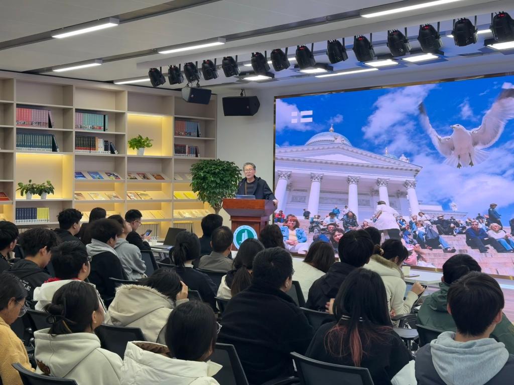 讲座上,杨知临结合自身留学背景和跨国企业的工作经历,介绍了芬兰的概况、风土人情、教育体系,以及中国和芬兰在教育与商业领域的合作实践与前景展望,并从国家发展战略考量、国际化人才培养趋势和学生升学就业需求三个方面,深入分享了加强中芬教育合作对深化国际化人才培养的重要意义。